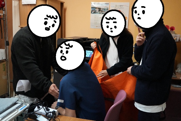 冷静に話し合って方針を決めて掛け声を発しながら、安全に患者さんを搬送します。