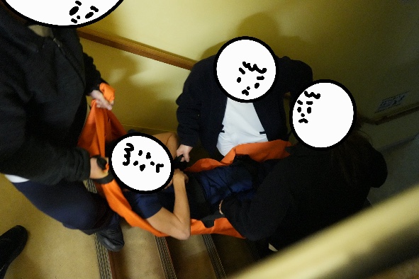 セラピストが怪我をした方のところに駆けつけ、搬送のやり方を考えます。相談しながら物をどかしたりポジションを変えたり患者さんを搬送するために最適な方法は何か模索します。